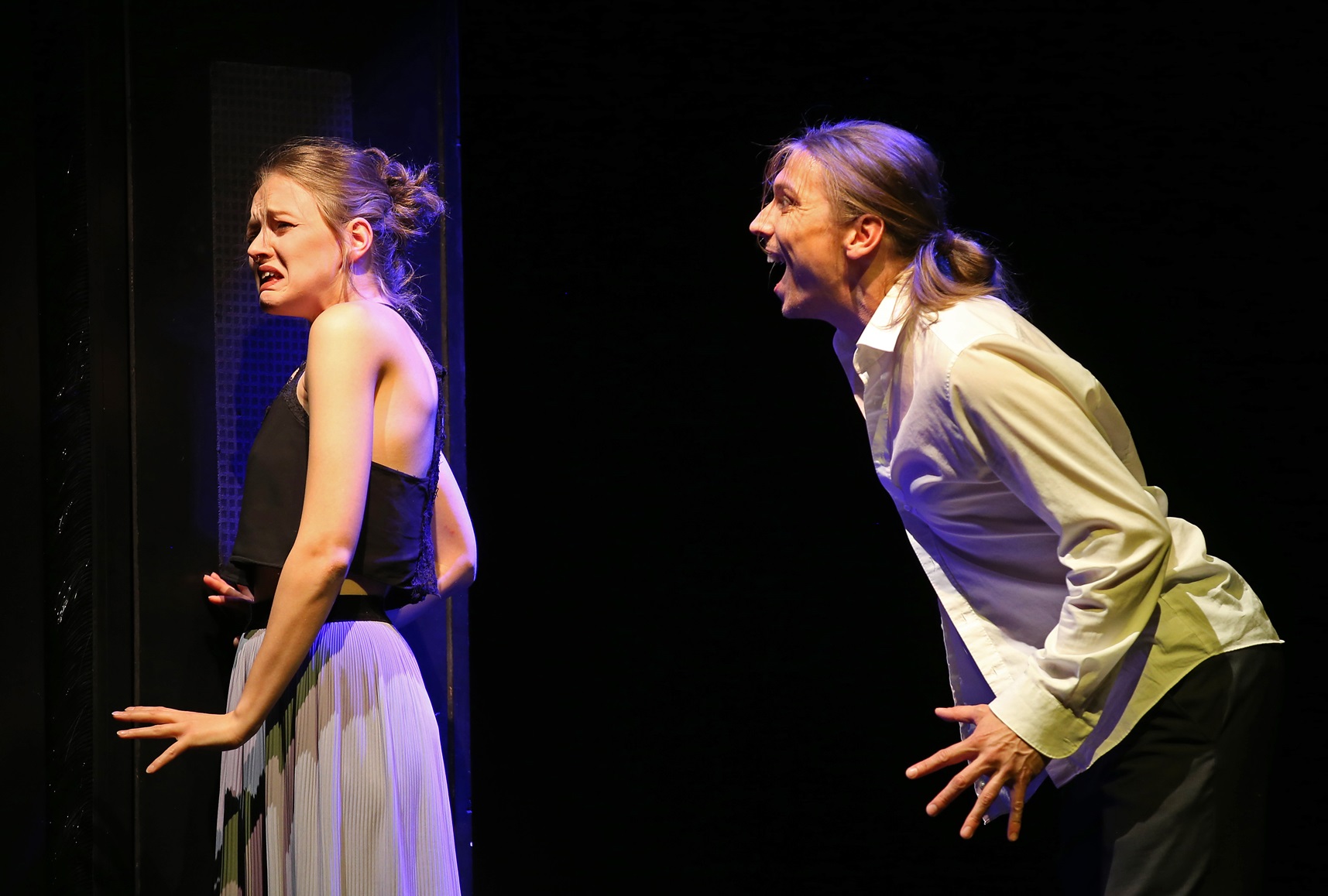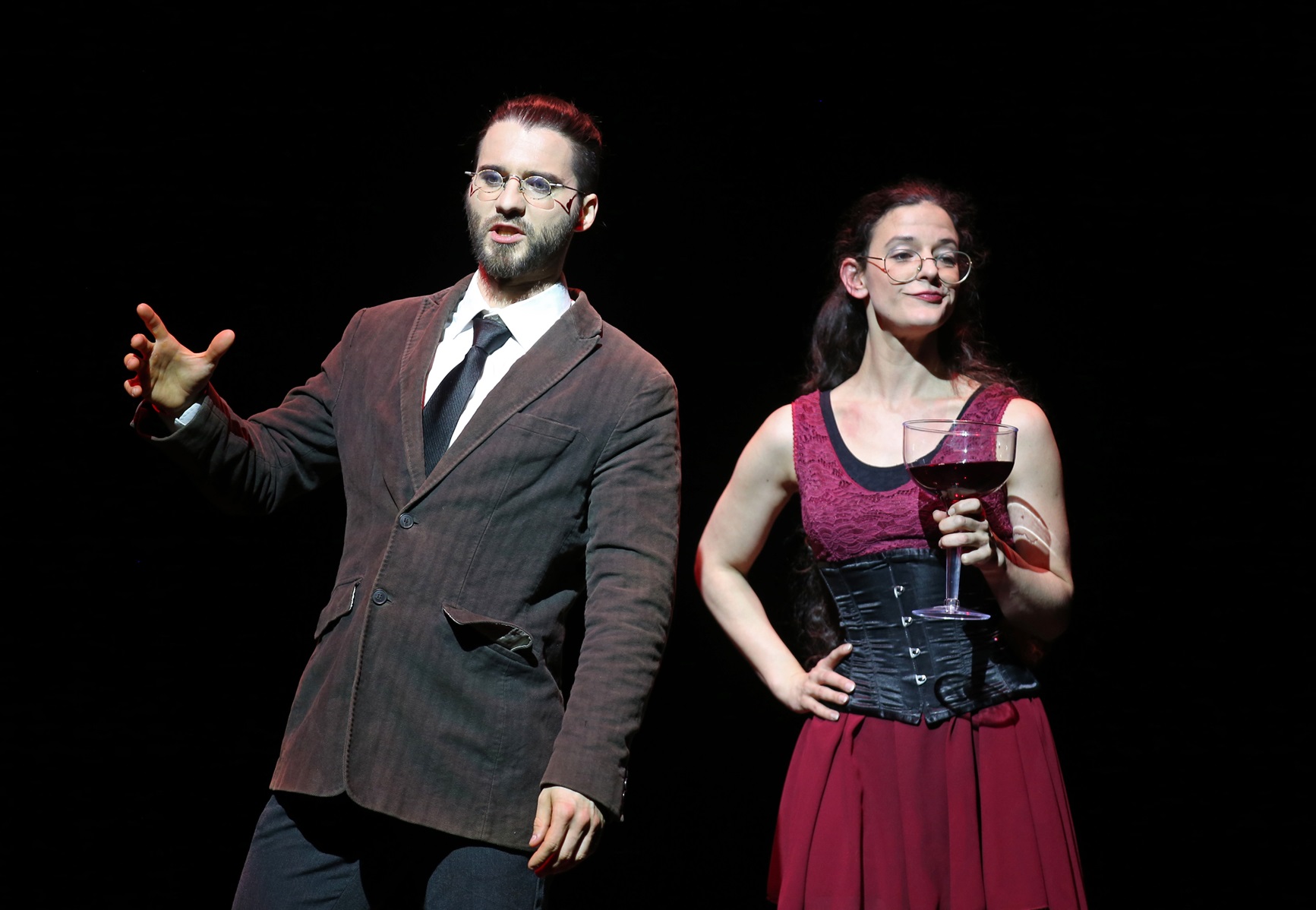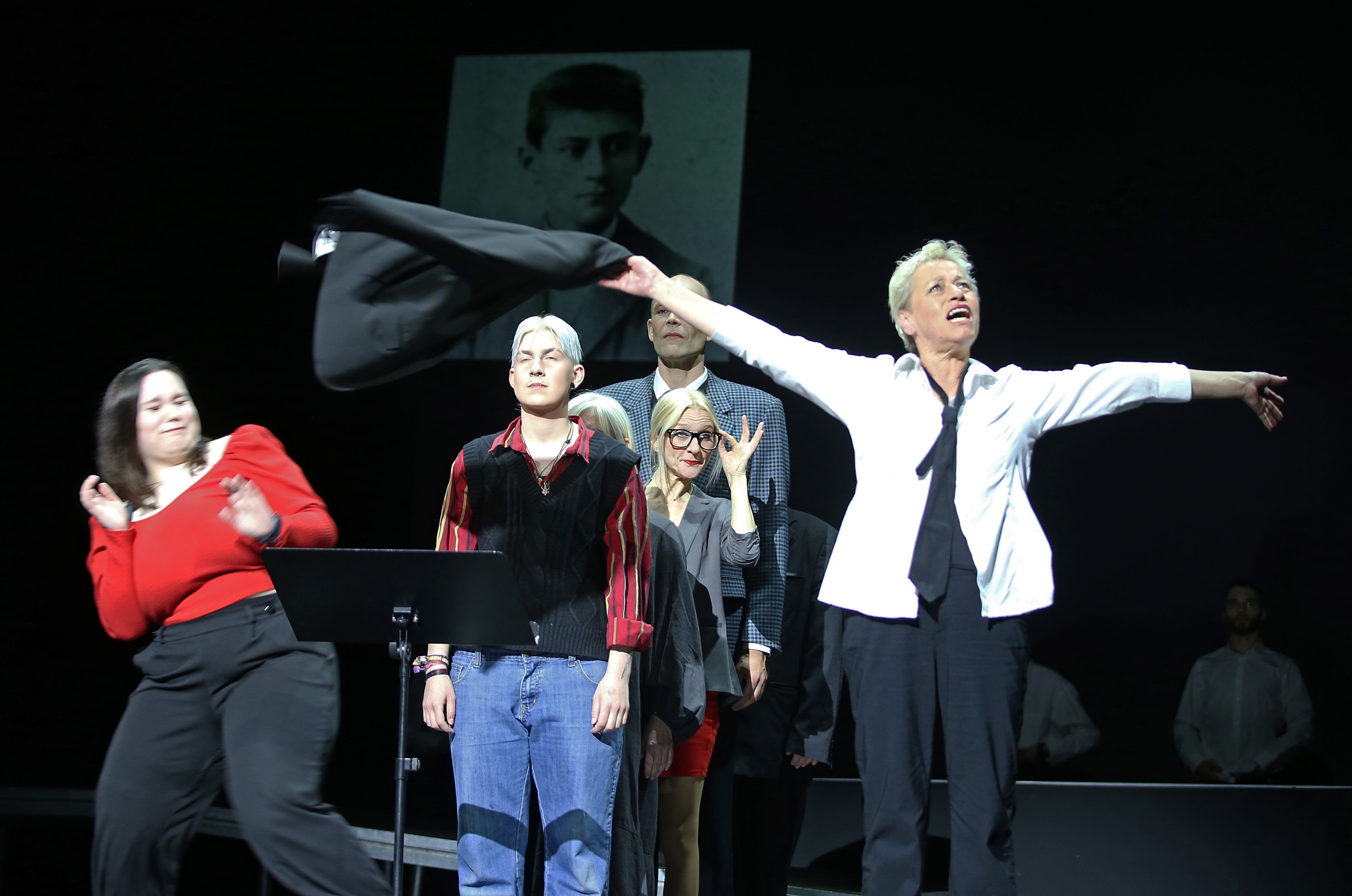 Über 100.000 Tik-Tok-Videos zum Thema #Kafka zeigen, wie gut das „Kafkaeske“ unsere Zeit widerspiegelt: Entfremdung, Isolation, existenzielle Angst, individuelle Ohnmacht, übermächtige Institutionen, Absurdität. Um in diesen Ausweglosigkeiten bestehen zu können, gibt es entweder keine oder höchst groteske Lösungen, man rettet sich in das Aus- und Verlachen. Genau diese Seite Kafkas wollen wir zeigen – nicht die düstere, sondern die komische. Entstanden ist eine szenische Folge von Erzählungen und Textschnipseln, ineinander verwoben in eine dramatische Theaterform, zubereitet mit bühnentechnischen Effekten und musikalischer Klangvielfalt. Fotos: Bernd Müller